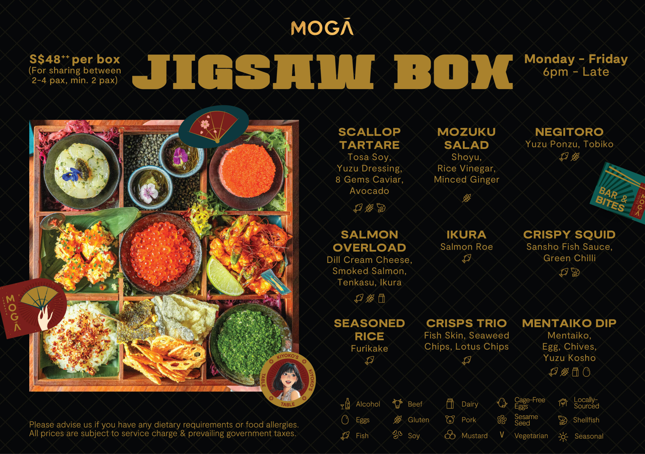 Launching on 17 November, the Jigsaw Box is designed for 2 to 4 guests and priced at $48++ per box (minimum 2 guests required to order), this inventive creation takes the spirit of celebration and gives it a MOGA twist — lively, shareable, and full of flavour.